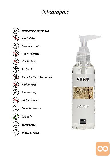 Lubrikant Sono temelji na vodni osnovi in je bil zasnovan posebej za izboljšanje občutkov med analnim seksom. Izdelek ima povsem nevtralno formulo ter je brez maščob, barve, vonja in okusa. Njegova formula je 100% telesu prijazna in je dermatološko testiran.