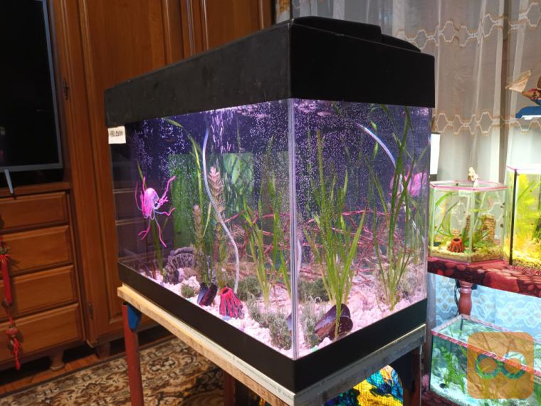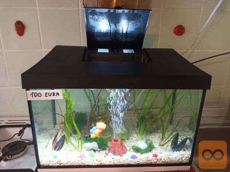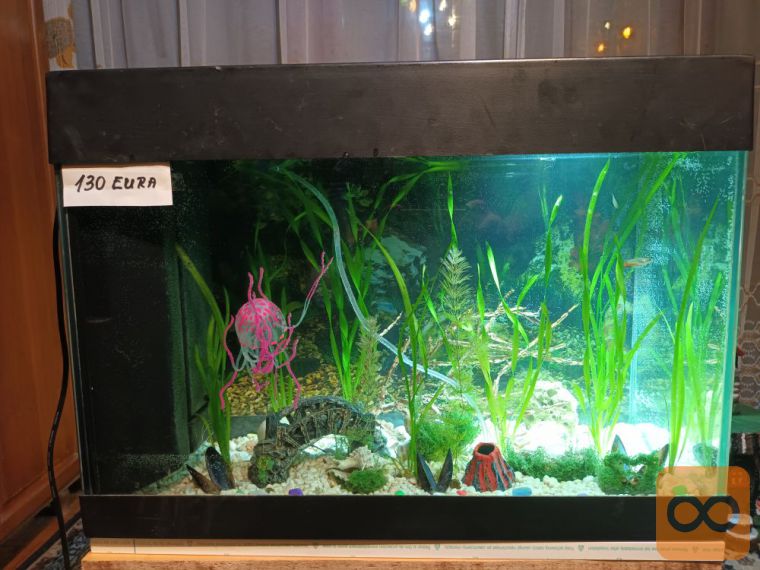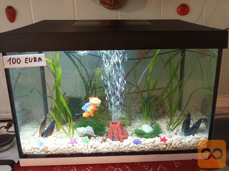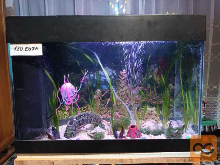 Kompletno uređen akvarij, 80 litara, sa poklopcem, svijetlom, ribicama, puževi čistači, akvarijski pijesak, ukrasno drvo, ukrasi, prodajem za 130 eura. Novi Zagreb Utrina, +385 91 9240-293.